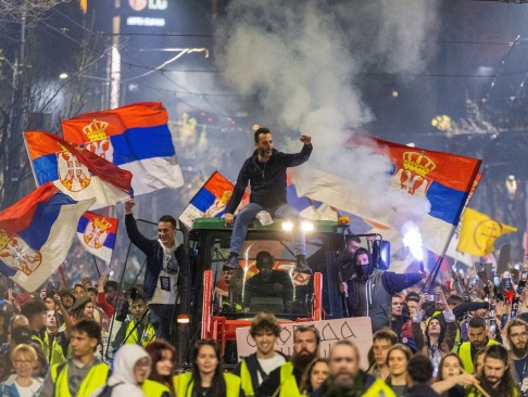 "После майданов в Киеве прошло больше 10 лет. Но их повторение в Сербии выглядит как калька того, что происходило на Украине: скачущие и орущие дурацкие лозунги-кричалки "протестанты", плакаты с требованием "люстрации" (так и написано, но с использованием латиницы), выстроенные в колонны группы молодежи во главе со старшими со свистками и красными нарукавными повязками.