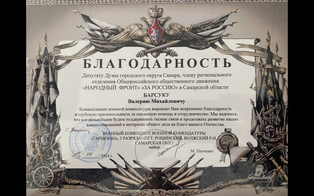 Председатель Совета Самарского регионального отделения партии "РОДИНА", депутат Думы городского округа Самара, член регионального Штаба Народного Фронта в Самарской области Валерий Барсук ведет большую работу по сбору гуманитарной помощи для участников СВО, оказывает деятельную поддержку военнослужащим в обустройстве служебных помещений, в создании наиболее благоприятных бытовых условий, повышающих боеспособность и эффективность вооруженных сил.