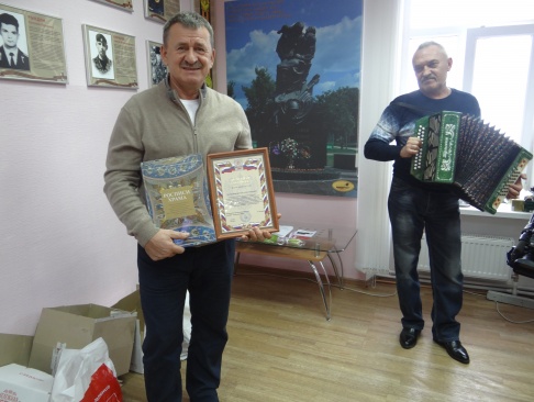 В дополнение к поздравительной речи Трифонов вручил 6 микроволновых печей, а также 25 продуктовых наборов.